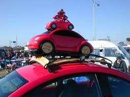 なかなか憎いディスプレーですよね、これは!いいじゃありませんかこのNewBeetle。ルーフキャリアにのる子ガメならぬ子Bug(笑)