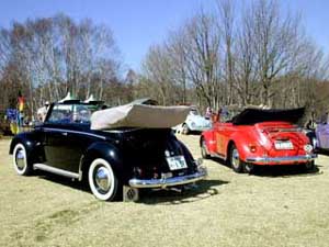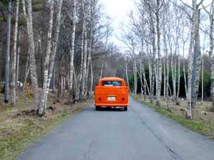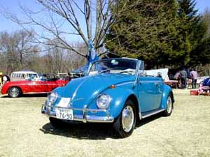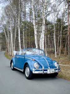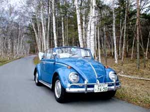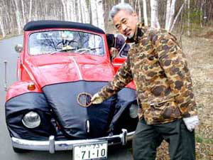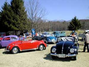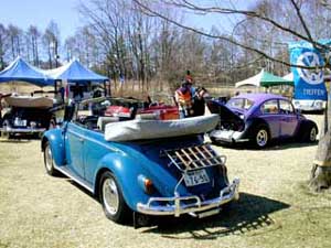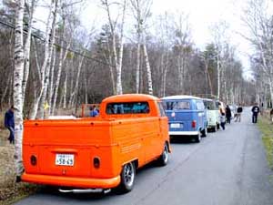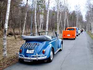 左は白樺並木でひと休みのVW達。右は某KENさん。枝で作ったVWマークで御機嫌上々!自然が似合う人。