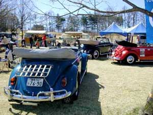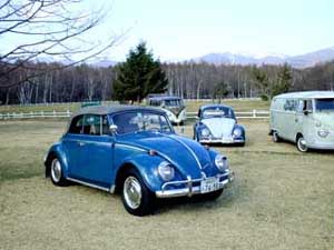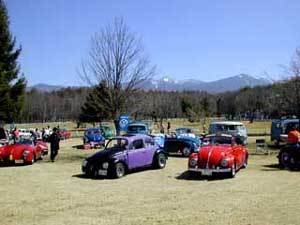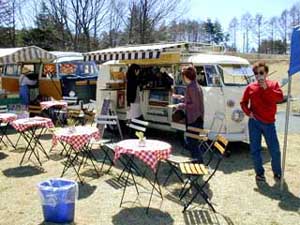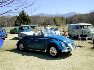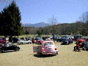 八ヶ岳をバックに。天気に恵まれ気分はVWの古郷ドイツのイベント!右はお馴染みのカフェ。後ろは手作りパン屋さん